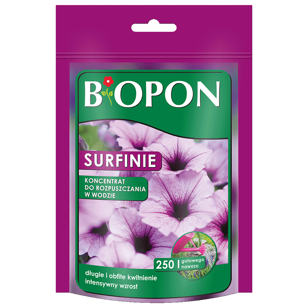 Najwyższej jakości nawóz krystaliczny rozpuszczalny w wodzie, opracowany specjalnie do nawożenia surfinii. Odpowiednio dobrane proporcje łatwo przyswajalnych makro i mikroelementów zapewniają optymalny wzrost roślin. Podwyższona zawartość potasu pobudza je do obfitego kwitnienia. Zawartość żelaza zapobiega żółknięciu liści nadając im intensywny zielony kolor. Odpowiednia dawka fosforu i potasu pozwala na uzyskanie pięknych, intensywnie wybarwionych kwiatów.